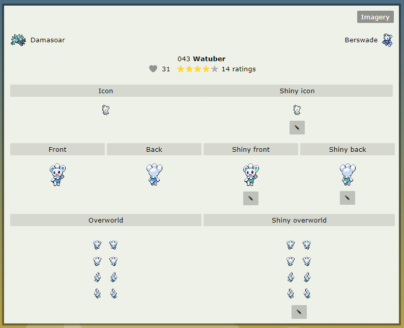 All Mons must have pixel art imagery. To count as "complete", a mon must have all of the following sprites: Front sprite, back sprite (full-body), icon, overworlds, and shiny sprites. Pokéngine features a shiny editor that allows users to edit color palettes of sprites that were uploaded to the site.